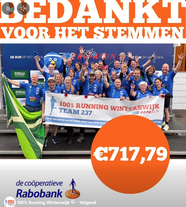 Dankzij de clubactie van de Rabobank en jullie stemmen, hebben wij weer een mooi bedrag mogen ontvangen ten behoeve van de Roparun.
